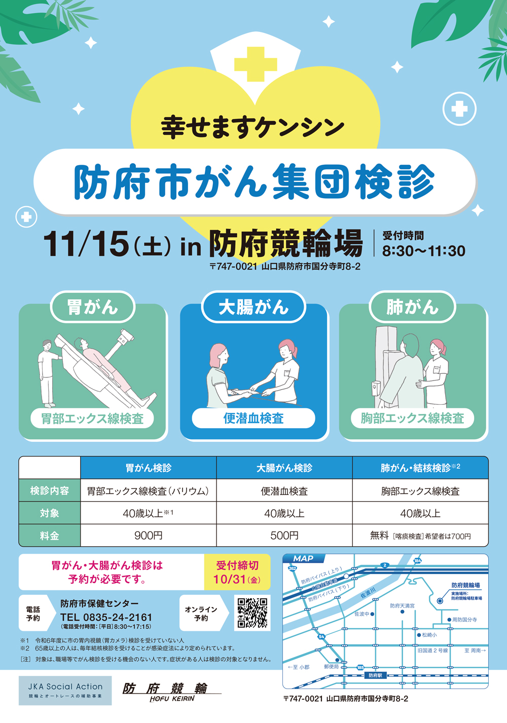 防府競輪場で、胃がん(X線)検診、肺がん・結核検診、大腸がん検診をまとめて受診できる集団検診を開催。がん検診会場では、希望者の方に肺年齢測定も実施。