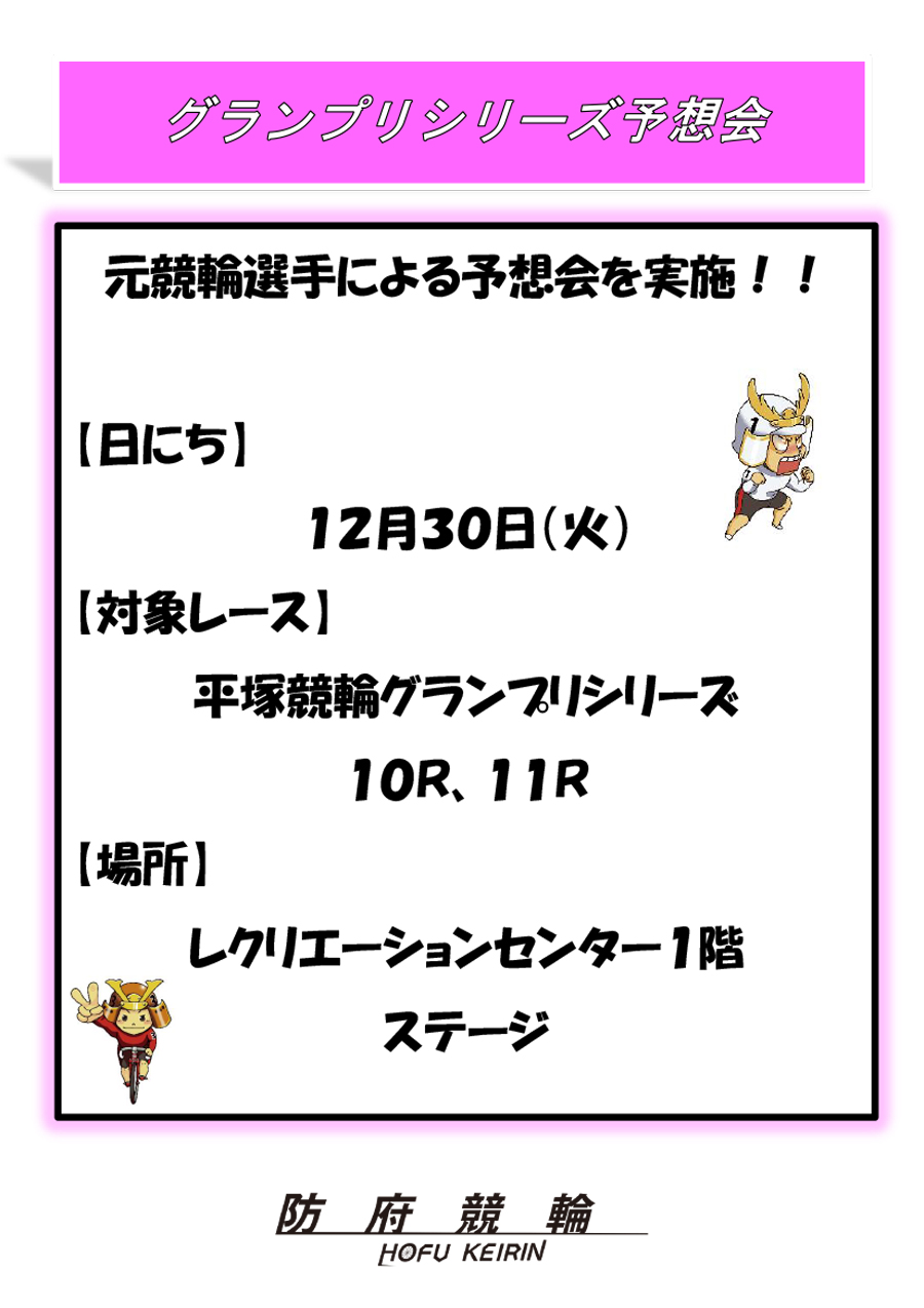 先着プレゼント 12/30(火) 10時(開門)~ メインスタンド南側出入口付近 ①ホープ君せんべい(88名分) ②GPシリーズオリジナルウェットティッシュ(100名分) ③GPシリーズオリジナルメモ帳(100名分)