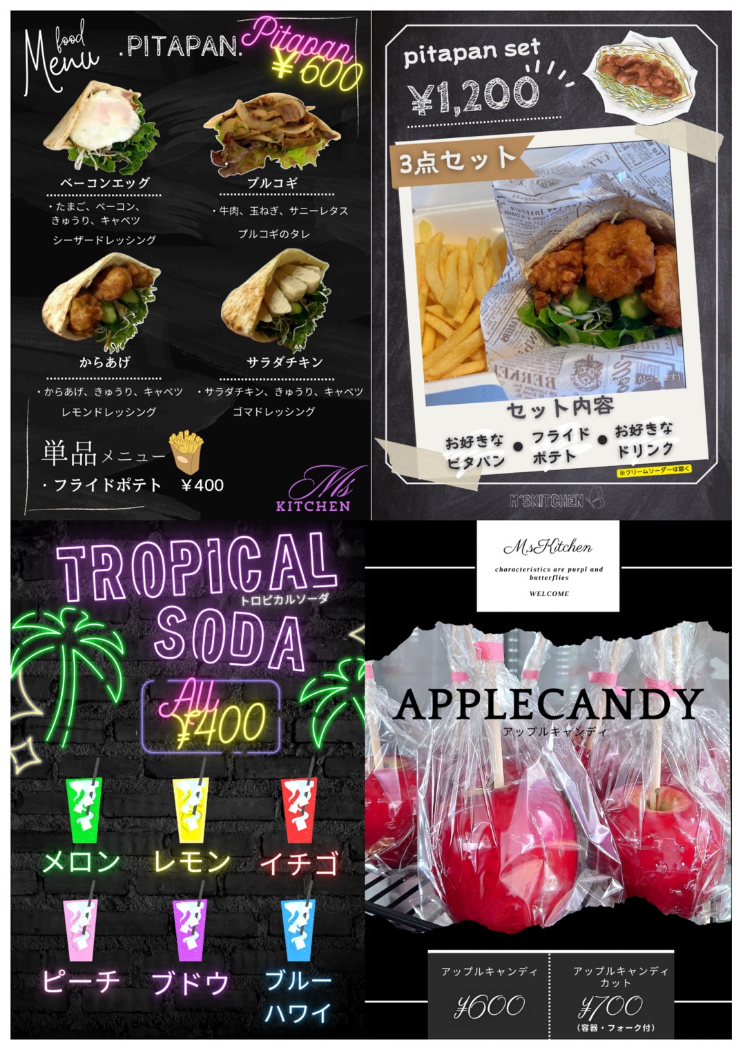 ピザ・フライドポテト・からあげ・チュロス・かき氷・レモンスカッシュ・スムージー